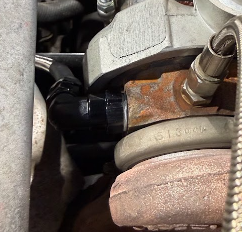 When I installed this, I had the AN line already tightened onto the elbow. I didn’t think I would have space to tighten the AN fitting onto the elbow and I appeared to be right. Thankfully there’s just enough clearance to fit the elbow on!