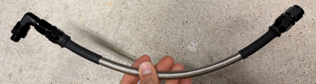 Up to this point all the “an lines” I’ve made have been nylon braided ones and never a “PTFE” one. Had to do a little research on this, but really it’s pretty easy to do thanks to YouTube. Although the super thick wire cutters I used for the Nylon one was no match for this. So I had to resort to regular cut off wheels. I also didn’t see any reason to stick with a Banjo bolt. I talked to a few colleagues and none of us could come up with a reason we want to restrict flow. Per AI, a regular right angle connector would flow about 60% more coolant than the banjo bolt and since this is just cooling a turbo that gets notoriously hot, I figured that was a good thing.