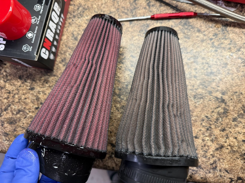 I also finally cleaned my K&N filters. These filters have been on the car since roughly 2018, and have never been cleaned. While they didn’t drive that many miles (about 3,000) they have sat in dusty areas and everything. I bought the K&N Filter cleaning kit ( 995000 ) and used the cleaner part twice. Even after that the filter didn’t really look clean on it’s own, but once you add the oil it really turns red and looks good.