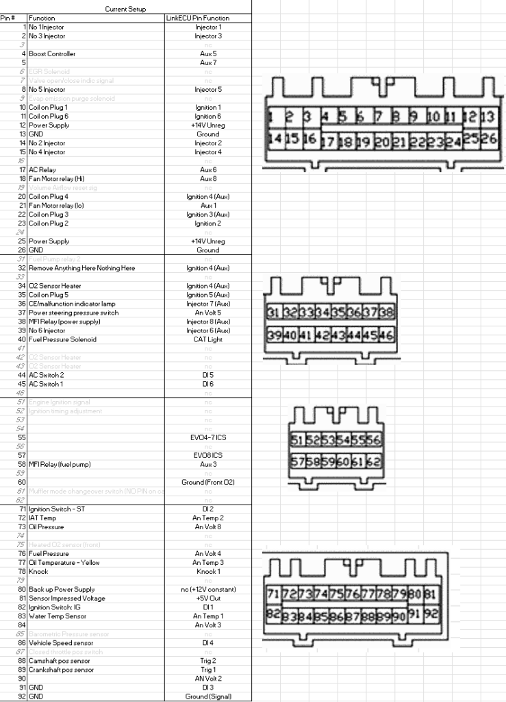 My “heavily” modified ECU Pinout with the connector right next to it. This image was vital for me working under the dash plugging everything in.